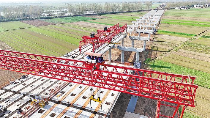 在一次建设中机器轰鸣的现场,一台气势磅礴的造桥机缓缓举起一根箱形大梁,就像一只巨臂托着银灰色的“积木”,精准地落到桥墩顶上。吴中高速京宜段二标标段生产副总监刘全介绍,为方便大桥施工,全线设置了两个提梁站,采用提梁机和过岸龙门吊相结合,精准有序地进行梁板吊装。