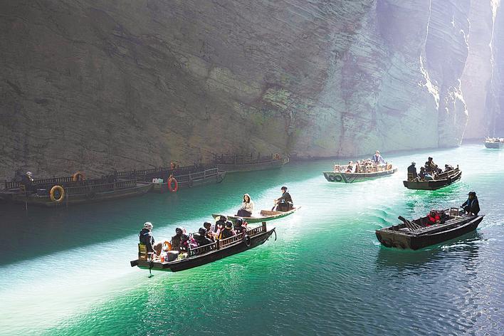 11月24日,游客乘船穿越鹤峰县屏山峡谷。初冬时节,希拉延峡谷呈现出迷人的景色。中午,阳光透过地面深深的裂缝,照亮了蜿蜒的“天线”。船仿佛漂浮在空中,不少游客前来打卡,游客数量和景区游客人气不断上升,实现了淡季也旺盛的目标。